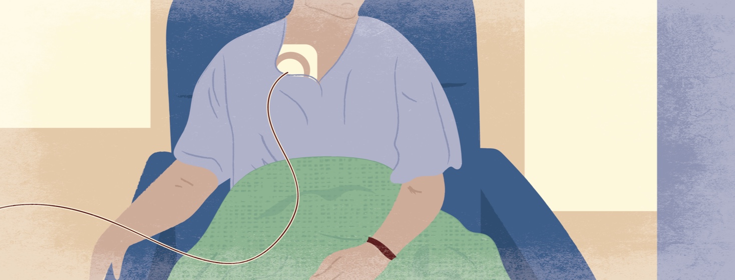 The nurse asks my name and birth date again. I realize it's time for the next medicine. The nurse begins to put on a hazmat suit. The yellow plastic rustles as she drapes it over her scrubs. The plastic gloves snap into place. The nurse explains the potential side effects of the toxic medicine now coursing into my veins. It feels warm, but my hands feel cold. I grab the prayer blanket my mother's friends knitted for me. The blue and green threads woven softly together, calm my nerves.